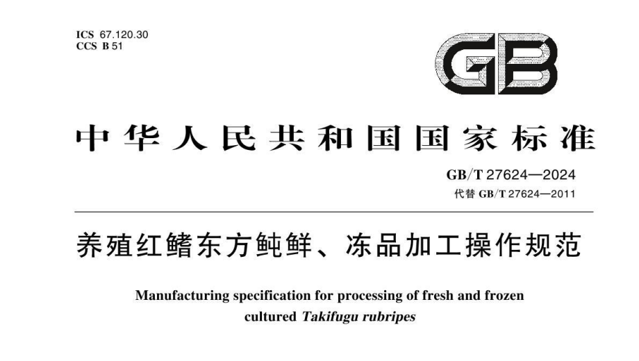 國家標準GB/T27624-2024《養(yǎng)殖紅鰭東方鲀鮮、凍品加工操作規(guī)范》正式發(fā)布